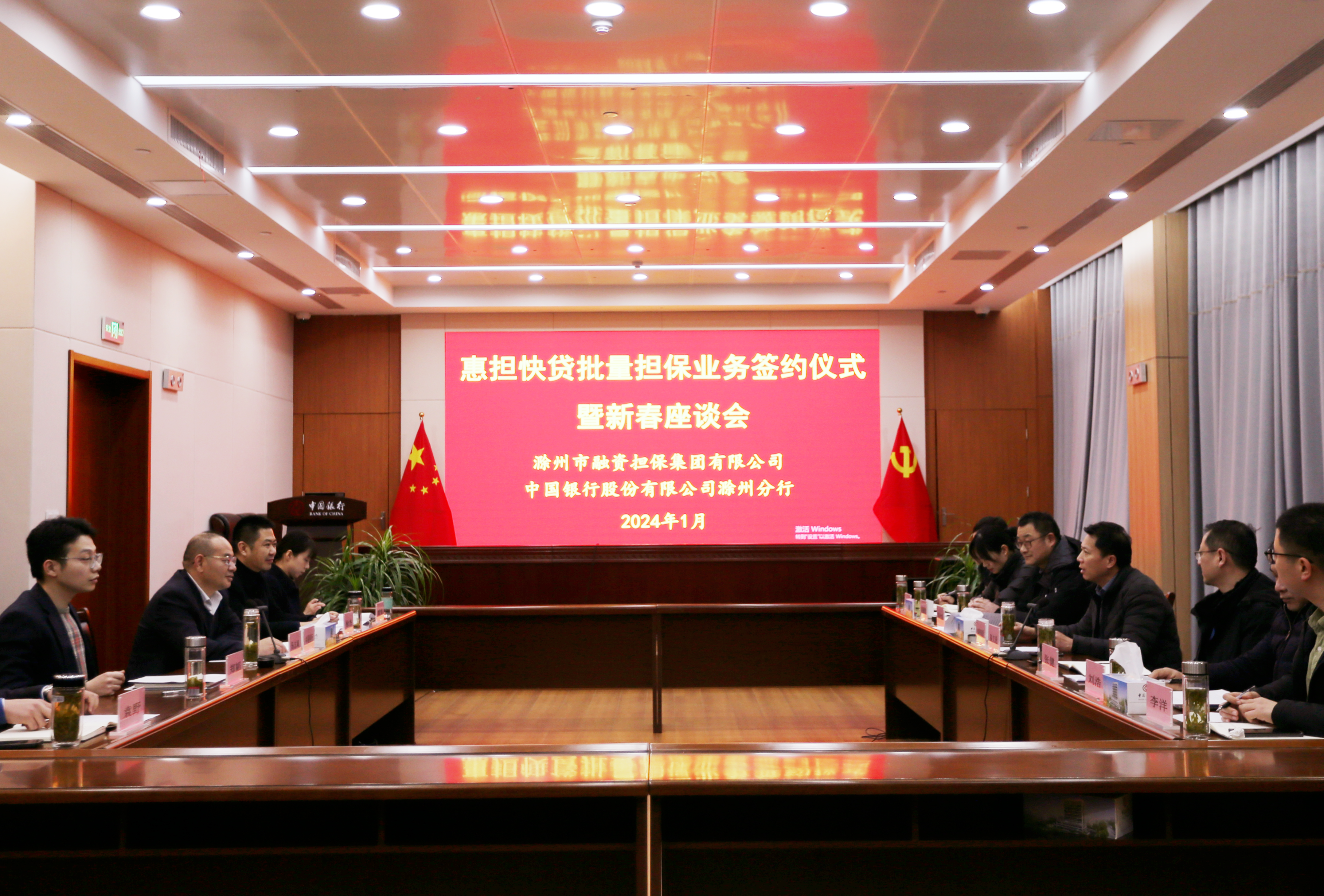 1月18日下午,滁州市融資擔(dān)保集團(tuán)有限公司與中國銀行滁州分行舉行“惠擔(dān)快貸”批量擔(dān)保業(yè)務(wù)簽約儀式暨新春座談會(huì)。市擔(dān)保集團(tuán)黨委書記、董事長、總經(jīng)理高文進(jìn),中國銀行滁州分行黨委書記、行長湯志斌出席簽約儀式,雙方業(yè)務(wù)部門負(fù)責(zé)人以及企業(yè)代表參加。集團(tuán)黨委委員、副總經(jīng)理張健與市中行黨委委員、副行長徐杰代表雙方簽署合作協(xié)議。