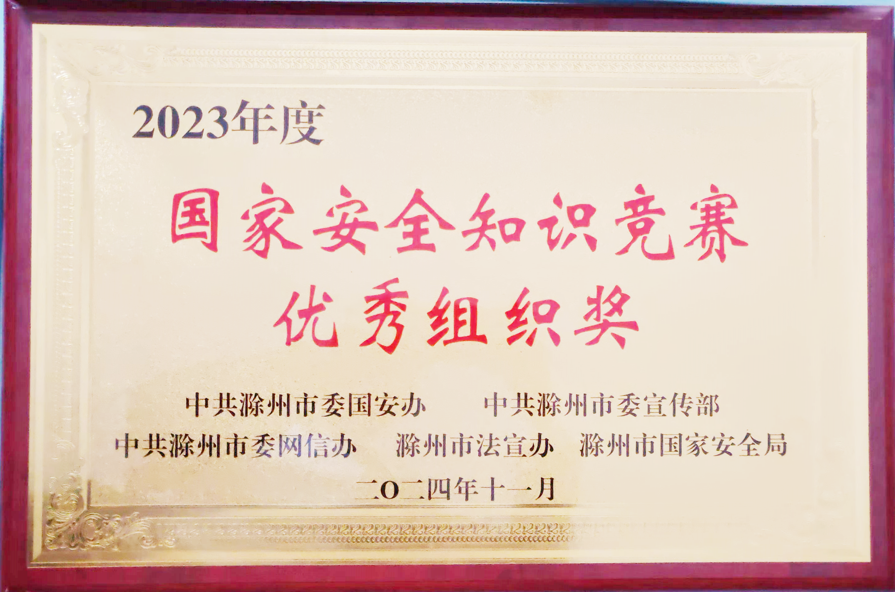 近日,市擔(dān)保集團(tuán)榮獲滁州市2023年度“國(guó)家安全知識(shí)競(jìng)賽優(yōu)秀組織獎(jiǎng)”,該競(jìng)賽由市委國(guó)安辦、市委宣傳部、市委網(wǎng)信辦、市法宣辦、市國(guó)家安全局聯(lián)合組織開展,集團(tuán)已連續(xù)兩年獲此榮譽(yù)。