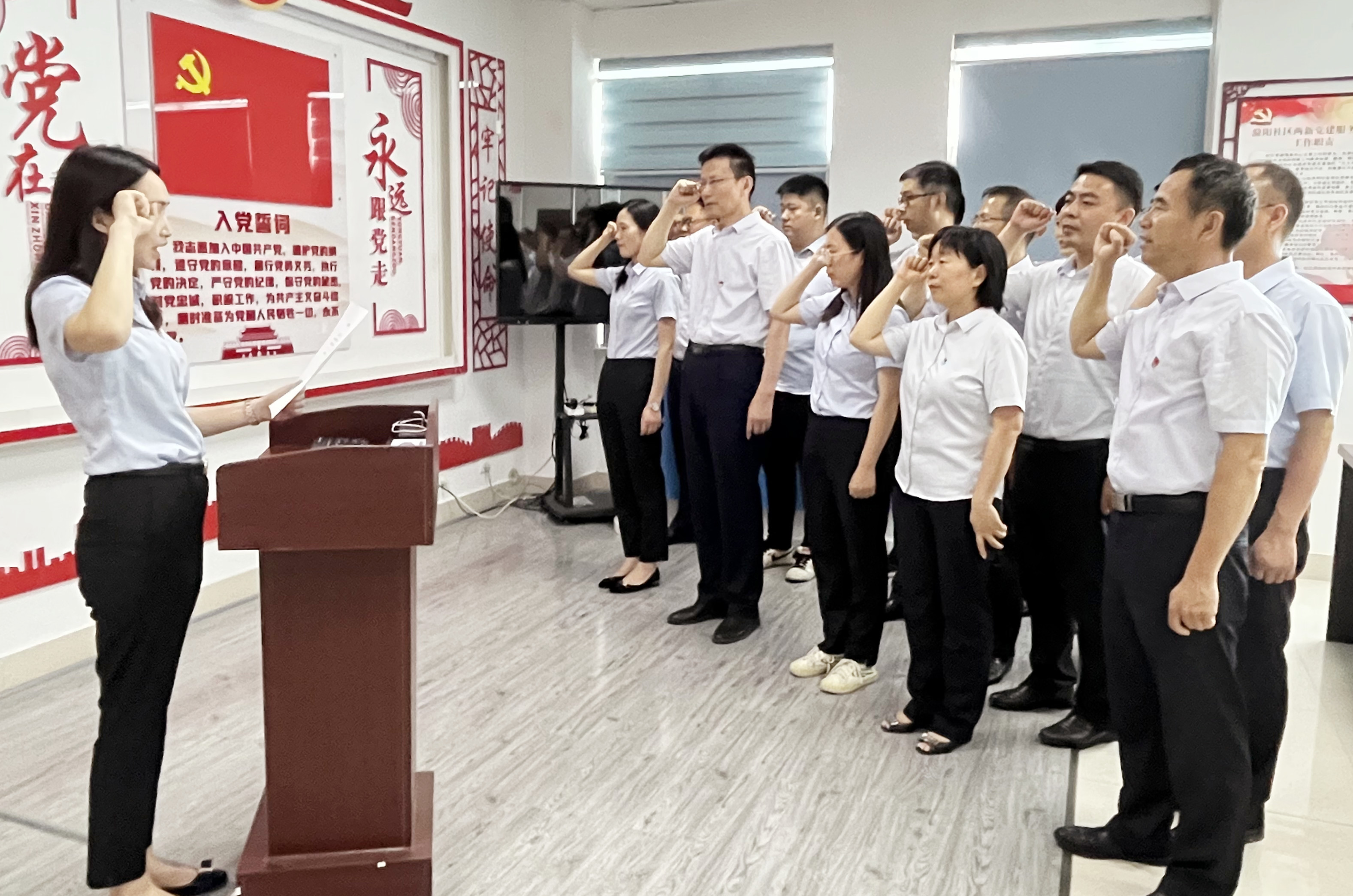 在活動現(xiàn)場,講解員引導(dǎo)大家邊觀看視頻和圖文資料,邊詳細(xì)解說相關(guān)內(nèi)容,從五個(gè)方面講述了中國共產(chǎn)黨建黨前的時(shí)代背景、中共一大召開時(shí)的情景以及紅船精神的內(nèi)涵和意義。全體黨員認(rèn)真觀看、仔細(xì)聆聽、深入思考,深刻地領(lǐng)悟了中國共產(chǎn)黨開天辟地、敢為人先的首創(chuàng)精神;堅(jiān)定理想、百折不撓的奮斗精神;立黨為公、忠誠為民的奉獻(xiàn)精神。增強(qiáng)了對“紅船精神”是中國革命精神之源的理解和認(rèn)識?;顒又?,全體黨員還面對黨旗,重溫了入黨誓詞。