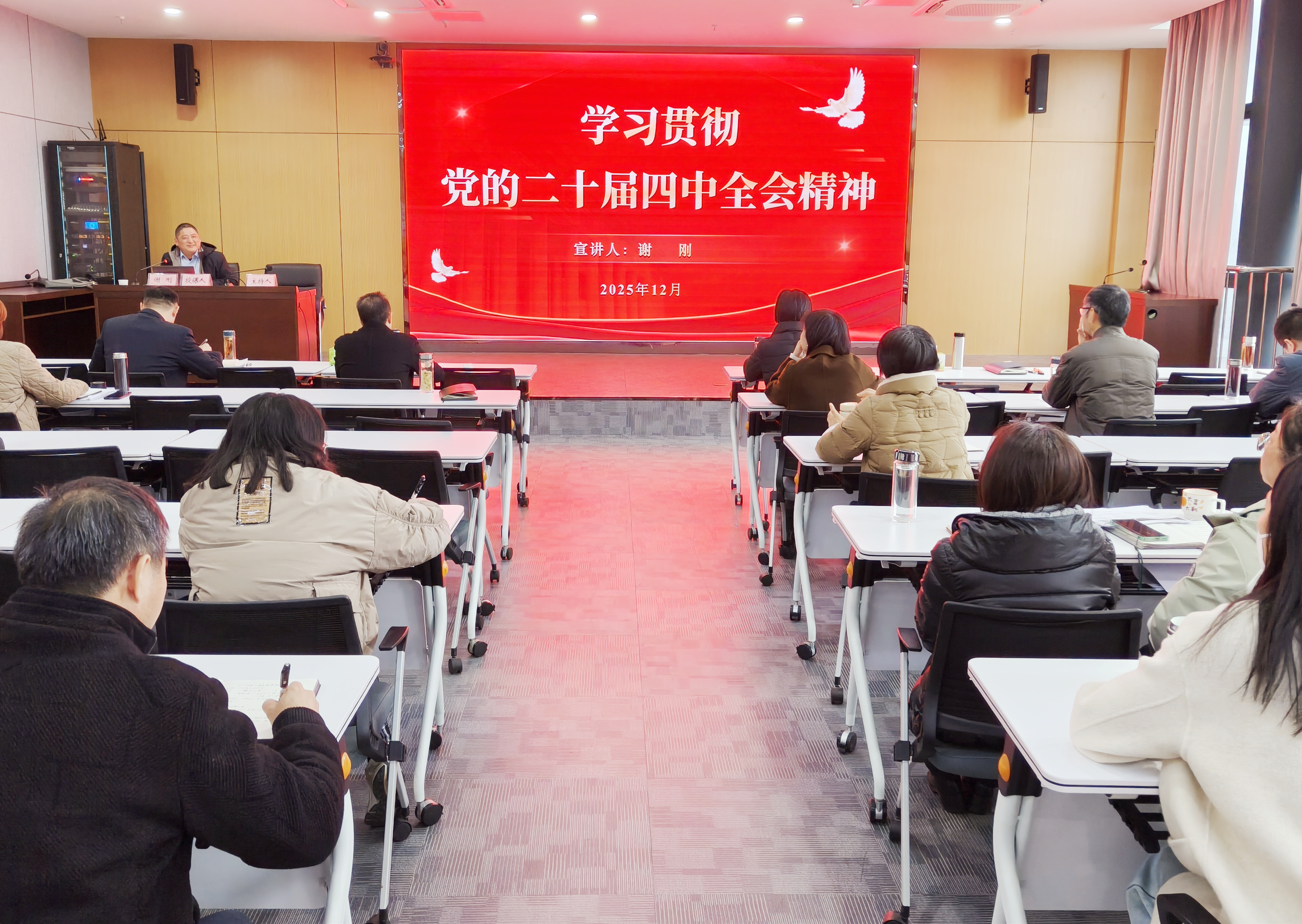 - 為進(jìn)一步學(xué)習(xí)好、宣傳好、貫徹好黨的二十屆四中全會(huì)精神,把思想和行動(dòng)迅速統(tǒng)一到黨中央的決策部署上來(lái),12月22日,市擔(dān)保集團(tuán)舉行“舉旗幟·送理論”學(xué)習(xí)貫徹黨的二十屆四中全會(huì)精神專題宣講報(bào)告會(huì),邀請(qǐng)滁州廣播電視大學(xué)黨委委員、副校長(zhǎng)謝剛作專題宣講報(bào)告,集團(tuán)及子公司全體干部職工參加學(xué)習(xí)。 報(bào)告系統(tǒng)闡釋了黨的二十屆四中全會(huì)的重大歷史意義、核心精神實(shí)質(zhì)和實(shí)踐要求,重點(diǎn)解讀了“十五五”時(shí)期發(fā)展指導(dǎo)方針、主要目標(biāo)和戰(zhàn)略任務(wù),并結(jié)合近期中央政治局會(huì)議及中央經(jīng)濟(jì)工作會(huì)議,為國(guó)有企業(yè)如何貫徹落實(shí)全會(huì)精神、把握經(jīng)濟(jì)大勢(shì)、融入國(guó)家戰(zhàn)略提供了細(xì)致的解讀與指導(dǎo),宣講內(nèi)容實(shí)踐性強(qiáng)、啟發(fā)性足。 會(huì)議強(qiáng)調(diào),學(xué)習(xí)貫徹全會(huì)精神,貴在理解、重在落實(shí),集團(tuán)全體干部職工要以此次報(bào)告會(huì)為契機(jī),在深化學(xué)習(xí)、融會(huì)貫通、擔(dān)當(dāng)實(shí)干上持續(xù)用力,切實(shí)把學(xué)習(xí)成果轉(zhuǎn)化為攻堅(jiān)克難、推動(dòng)發(fā)展的具體行動(dòng),全力完...